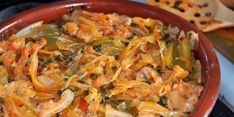 Añadir el tomate y las verduras cortadas, incluyendo la col y los tomates pelados y picados, en trozos no muy pequeños. A continuación añadir el pimentón y sazonar. Añadir el agua y dejar que se cueza todo. Una vez cocido, sacar la verdura de la cazuela, dejando el caldo dentro. Poner sólo una capa de pan en el fondo de la cazuela, dentro del caldo y la verdura encima. Dejar reposar el pan unos 15 minutos hasta que absorba el caldo. Servir en la misma cazuela de barro. Otro ingrediente que puedes añadir es el pimiento.